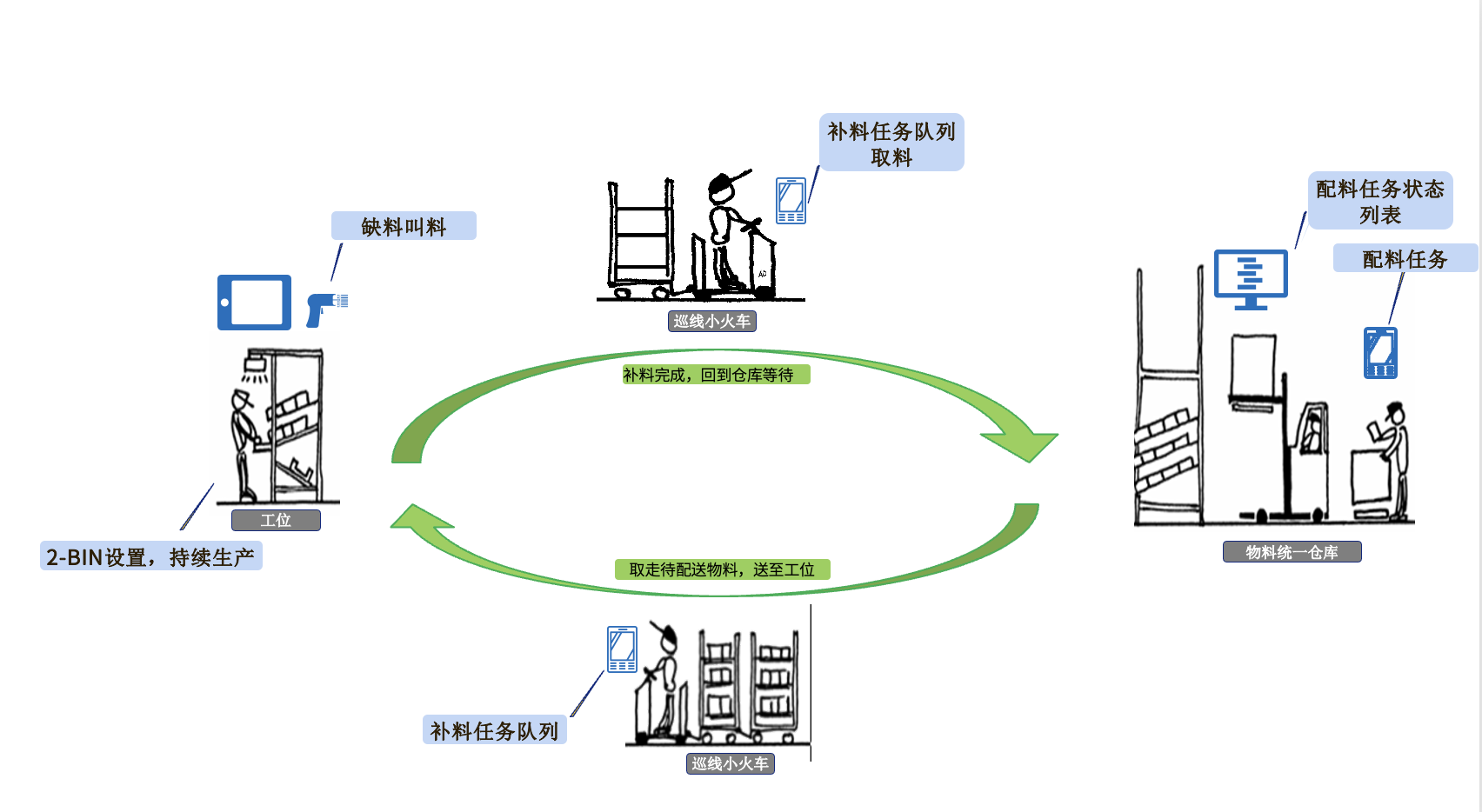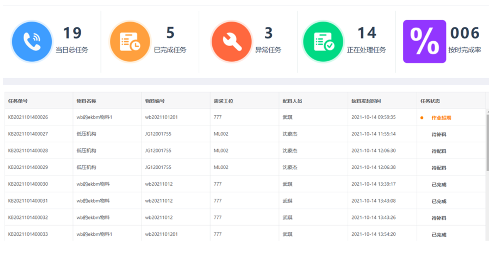 通过Ekanban系统能进行叫料,完成看板管理的原材料从仓库到产线的配送的线上管理。产线工人不需要到仓库去领料,仓库配料和补料人员可以按照一个任务清单,周期性的完成配料工作。与此同时,仓库管理员也可以随时看到现在配料和补料任务的进度负荷,以便对现场工作进行及时的调度和监控。